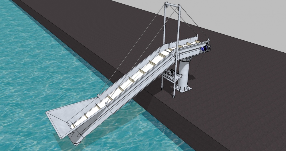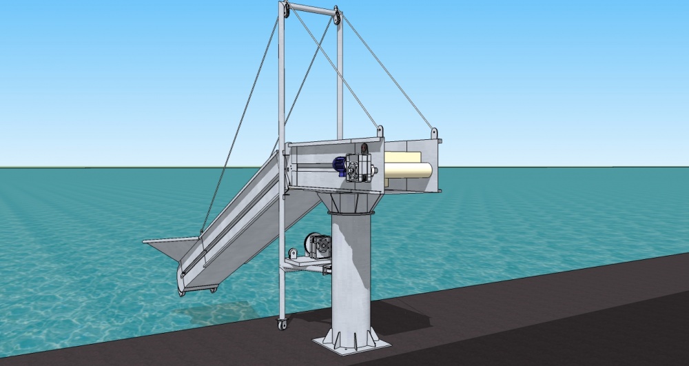 No processo de descarga de embarcações, a esteira de descarga auxilia na retirada do produto por um sistema de esteira articulada, que permite que o tanque tenha acesso ao convés do barco , o equipamento após a descarga pode ser facilmente recolhido pelo guicho e a torre giratória.
