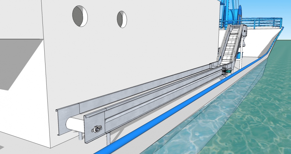No processo de pesca marítima, a esteira complementar auxilia na agilidade da coleta do pescado, recebendo, transportando e direcionando o produto para as tinas do barco.