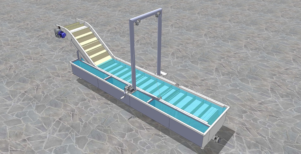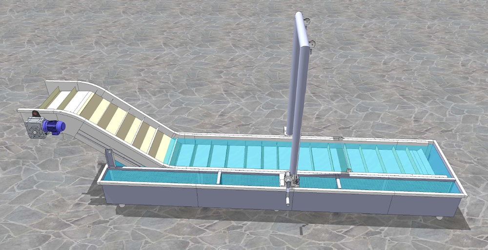 Acessórios : Moto-redutor elétrico trifásico, tanque de água com gelo, esteira transportadora com talisca, guincho de elevação com sistema de manivela