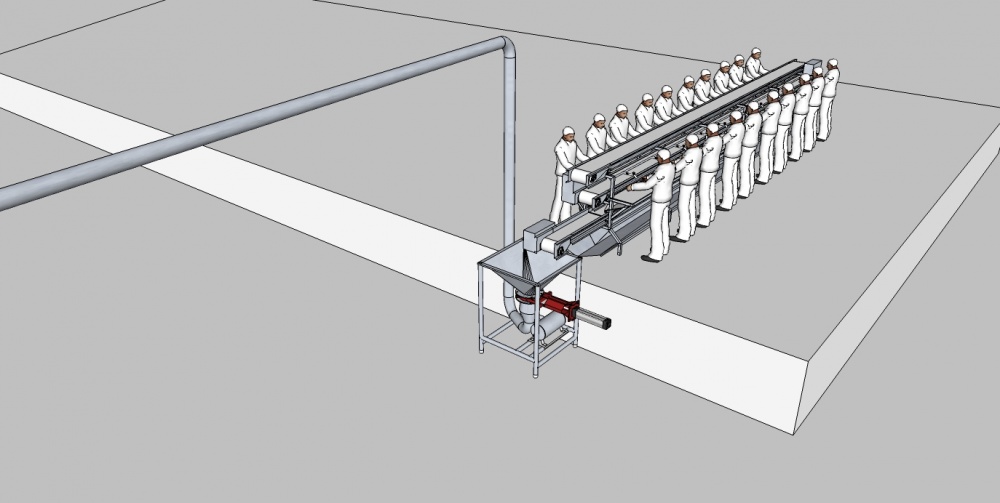 Após todo o processo de filetagem, evisceração, beneficiamento, os resíduos são direcionados para um dispensador com sistema de válvula shut , que faz o resíduo transportar dentro de uma tubulação até a caçamba de resíduos.