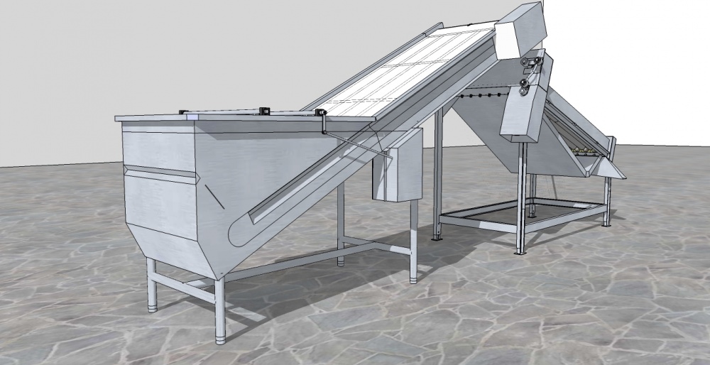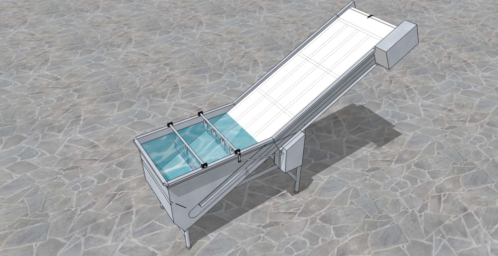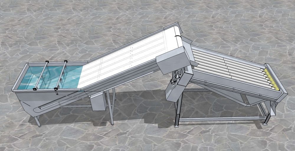 No processo de beneficiamento, o produto é colocado no tanque com água da máquina alimentadora, recebendo o movimento das pás agitadoras que auxiliam a subida e a distribuição na esteira antes da maquina descascadora.