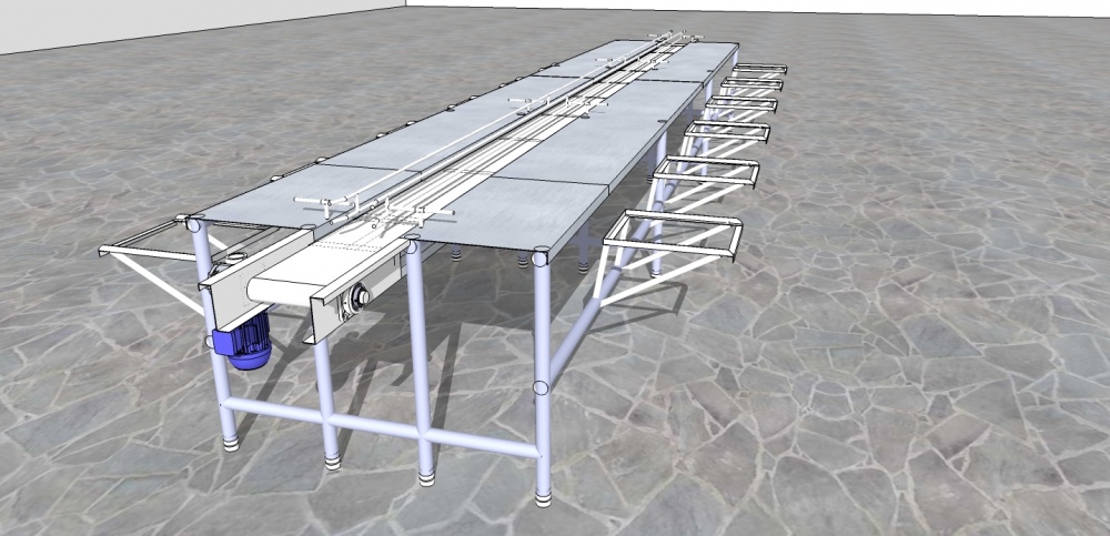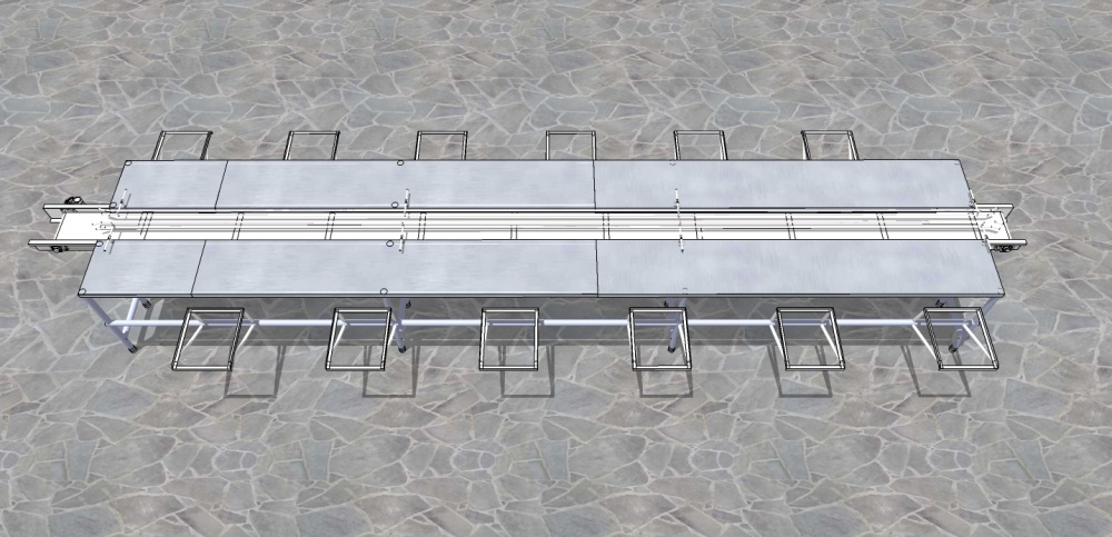 No processo de embalagem, o produto é direcionado manualmente para a mesa, o guia auxilia a passagem do pacote pela esteira central da mesa.