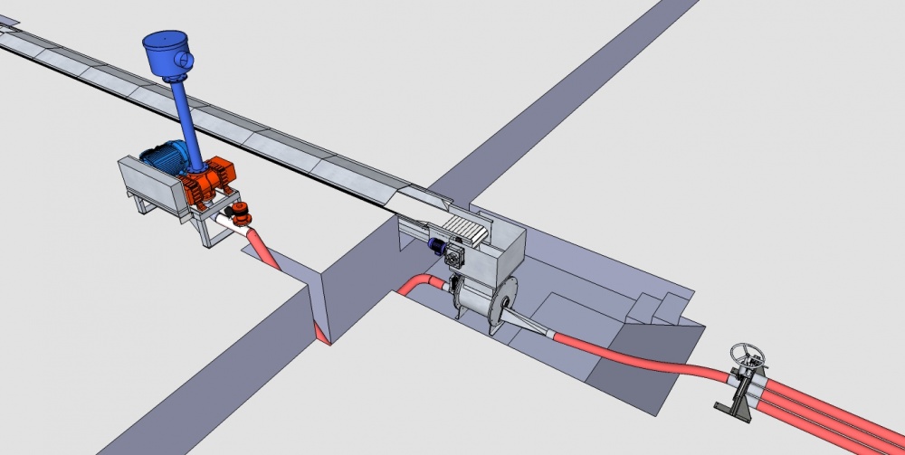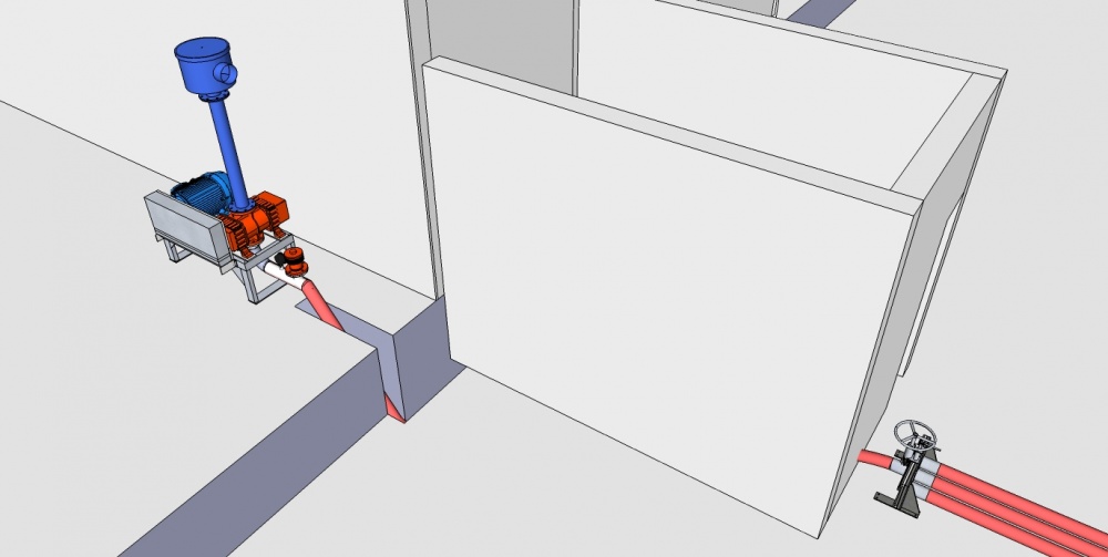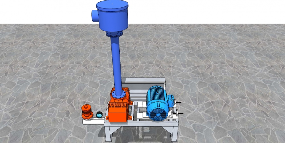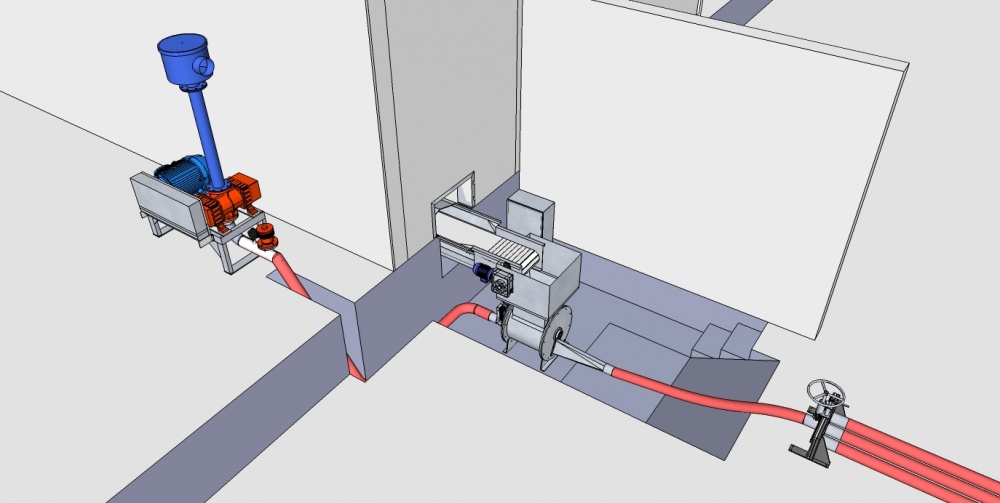 No processo de fabricação do gelo, desenvolvemos uma base para soprador e motor, que trabalham em conjunto, responsável por empurrar o gelo por uma tubulação, desde a válvula eclusa instalada na saída do silo de gelo até o local escolhido.
